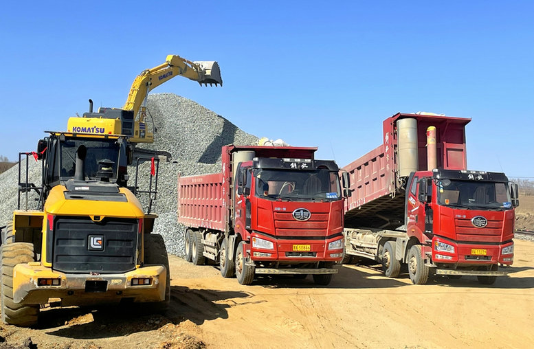 北黑鐵路K261+600至K272+500的10.9公里既有線路基段,需要路基加寬、邊坡護砌、修筑排水溝等改造施工,為九月初線路封鎖創(chuàng)造條件。節(jié)日期間,工人們正在進行路基高填方施工,35臺重型翻斗車正源源不斷地?fù)屵\土方,推土機、壓路機配合攤平碾壓,