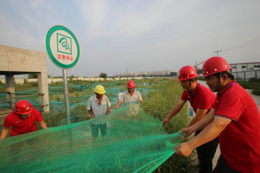 6、中鐵十八局集團(tuán)三公司寶坻管廊項目部項目經(jīng)理李賢松、副經(jīng)理溫興旺和技術(shù)人員在工地鋪設(shè)密目網(wǎng),防止產(chǎn)生揚(yáng)塵(伍振 攝)