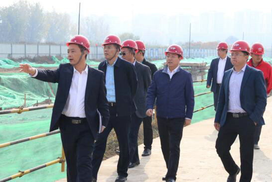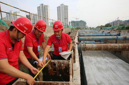 2、中鐵十八局集團(tuán)總經(jīng)理閆廣天、副總經(jīng)理陳建民、三公司津冀工程項目管理部經(jīng)理王海偉、寶坻管廊項目部項目經(jīng)理李賢松等在現(xiàn)場辦公( 周文婷 攝)