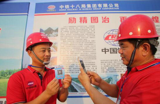 4、中鐵十八局集團(tuán)三公司寶坻管廊項目部打造信息化工地,圖為項目經(jīng)理李賢松在展示工作牌上的二維碼信息(伍振 攝)