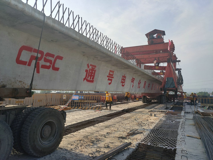 新鄉(xiāng)G107牧野大橋新建東半幅橋梁上跨京廣鐵路,位于衛(wèi)輝至新鄉(xiāng)北區(qū)間,橋梁與鐵路交角74.4°。鐵路上方第8跨為營(yíng)業(yè)線II施工,計(jì)劃在4次封鎖點(diǎn)內(nèi)架設(shè)4片30米箱梁。架梁前,項(xiàng)目部提前謀劃科學(xué)布局,對(duì)現(xiàn)場(chǎng)和技術(shù)準(zhǔn)備等工作細(xì)化分工,責(zé)任到人,合理配備生產(chǎn)要素,對(duì)施工組織、技術(shù)措施、安全交底等各個(gè)環(huán)節(jié)嚴(yán)格把關(guān),將本次架設(shè)的邊梁提前運(yùn)至現(xiàn)場(chǎng)指定位置,為架梁做好充分準(zhǔn)備。施工中,項(xiàng)目各層級(jí)、各崗位認(rèn)真履行安全管理職責(zé),從提梁、移梁、喂梁、落梁,現(xiàn)場(chǎng)人員緊繃神經(jīng),緊盯每一道工序,確保架梁全過(guò)程監(jiān)控、指導(dǎo),歷經(jīng)50分鐘的緊張奮戰(zhàn),順利完成首架任務(wù),實(shí)現(xiàn)正點(diǎn)銷記。