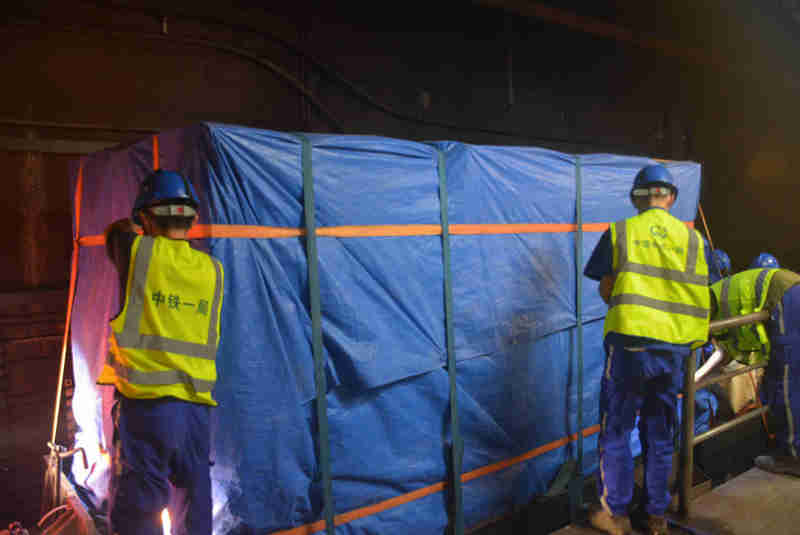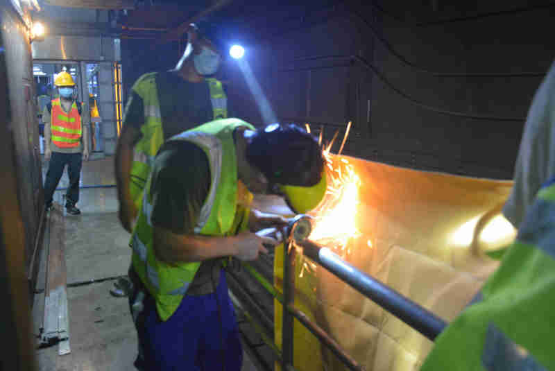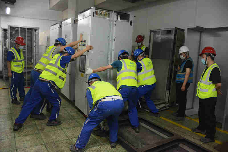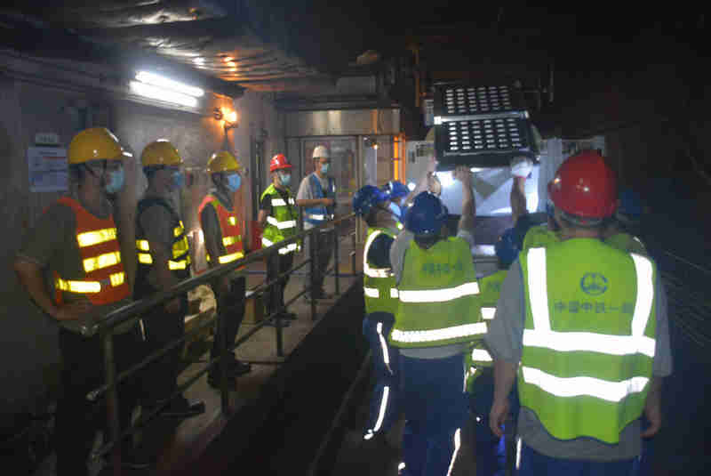 8月3日0時20分,屏蔽門準時打開,作業(yè)人員隨即進入軌行區(qū)開始作業(yè)。隧道內(nèi),一席席熱浪不斷襲來,最后一班車列車揚起的灰塵還未落定,切割防護欄作業(yè)就已經(jīng)開始,迸發(fā)出刺眼的光,產(chǎn)生的氣味和青色的煙塵充斥在隧道內(nèi),使得施工環(huán)境更加惡劣。掛好地線做好防護后,一組作業(yè)人員迅速爬上軌道車,開始抬起鋼板搭建轉(zhuǎn)運平臺,另一組作業(yè)人員同步開始拆除柜體防護篷布。這邊,軌道車上一組作業(yè)人員使用自制搬用小車將低壓柜轉(zhuǎn)運至平板車空處,另一組作業(yè)人員迅速將低壓柜傾放至轉(zhuǎn)運小車。由于軌道車和轉(zhuǎn)運平臺空間有限,一組只能安排7人,且轉(zhuǎn)彎過程需要及時控制小車速度及位置,這考驗著各小組之間的配合默契度?,F(xiàn)場施工緊張有序進行,高強度的體力勞動加之接近40度的隧道溫度,作業(yè)人員臉上的汗水不停地往外冒,蟄疼了眼睛、侵濕了衣服,她們揮起手臂用衣袖在臉上摸一把,便再次全神貫注投入作業(yè)。