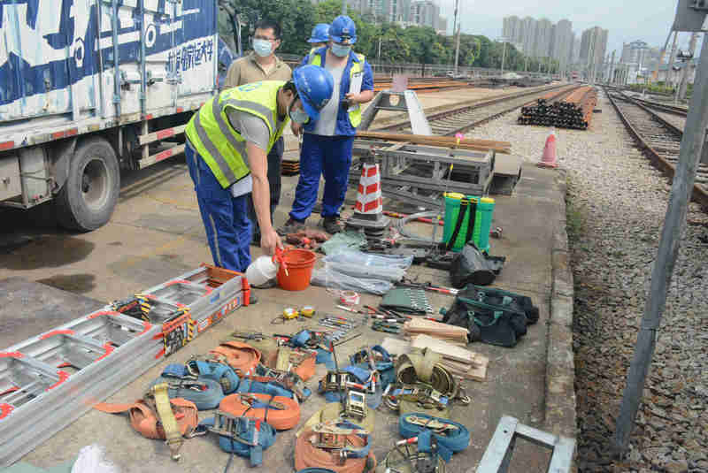 8月2日7時40分,30多名作業(yè)人員在項目部樓下整齊列隊,有序上車。此次施工任務(wù)是將11面新設(shè)備柜利用軌道車從西塱車輛段運送到楊箕站B所的I段,再將楊箕站B所II段12面舊設(shè)備柜裝車返回西塱車輛段次日交付運營。