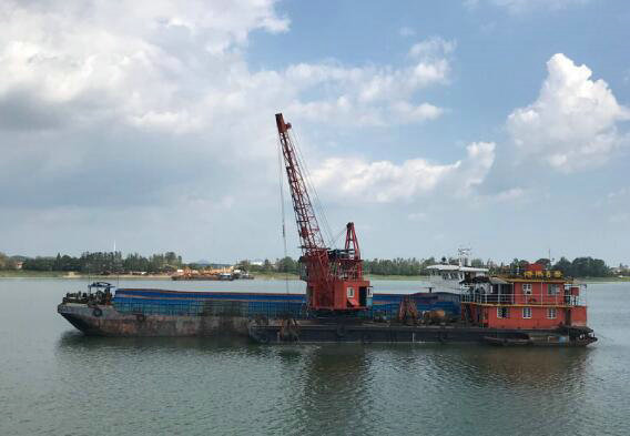 為了保證圍堰順利下水,河床清淤是當(dāng)前首要任務(wù),為此項(xiàng)目部引進(jìn)了具有GPS精確定位的抓斗船2艘,500噸運(yùn)輸船1艘,并且安排專(zhuān)人值守保證24小時(shí)不間斷作業(yè),確保主墩位置河床淤泥、石渣清理徹底,為后續(xù)圍堰下水打下堅(jiān)實(shí)的基礎(chǔ)。項(xiàng)目部要求抓斗船在水上施工作業(yè)中嚴(yán)格遵循文明與環(huán)保施工措施,清理出來(lái)的淤泥在岸邊指定的位置堆棄,防止污染巴河水域。石渣則用于項(xiàng)目便道填筑、路堤本體填料等項(xiàng)目,達(dá)到變廢為寶的目的。