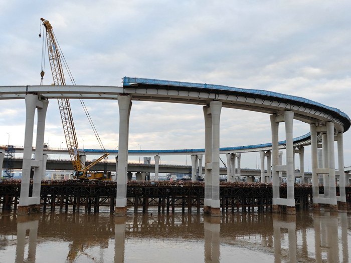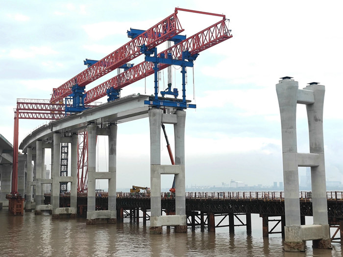杭甬復(fù)線濱海互通全長9705米,設(shè)樁基1027根、承臺169座、4座拼寬橋、8座匝道橋,6—25.5米的花瓶墩和圓柱式橋墩636座、20—30米的鋼混疊合梁470片,3座匝道橋上跨既有線金塘大橋,4座匝道橋與該大橋相接。濱海互通2021年初開工建設(shè)以來,樁基、承臺、墩身、架梁同步施工,不斷優(yōu)化人員和機械設(shè)備等資源配置。并根據(jù)互通整體承重、受力和施工難度大等實際,項目部會同設(shè)計、業(yè)主等單位對承臺、橋墩和鋼混疊合梁的數(shù)量進行了變更,使建成后的互通具有更加美觀、使用壽命長等特點。