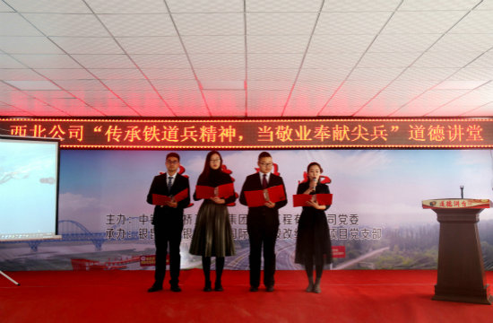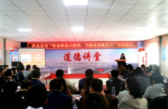 10月16日上午,中國鐵建大橋局西北公司舉辦了以“傳承鐵道兵精神,當敬業(yè)奉獻尖兵”為主題的道德講堂活動。此次活動共分為“省自身”“學模范”“講故事”“頌經(jīng)典”“談感想”“唱歌曲”和“送吉祥”七個環(huán)節(jié)。公司黨委書記韓福堂、總經(jīng)理赫宏偉等班子成員,公司機關各部室負責人,各基層項目書記、團委負責人及銀昆項目全體職工參加了此次活動。