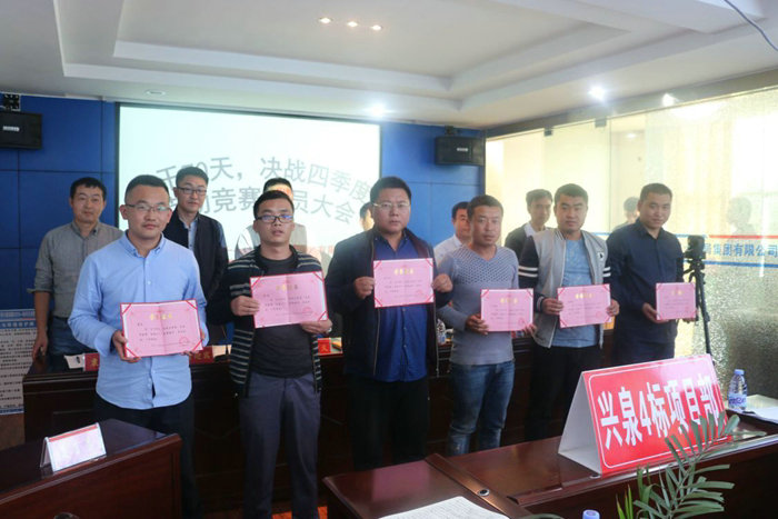 會(huì)上,賀迎賓首先通報(bào)了“大干30天 決戰(zhàn)三季度”施工生產(chǎn)完成及考核兌現(xiàn)情況,為兩家優(yōu)勝勞 務(wù)隊(duì)、優(yōu)勝架子隊(duì)及10名先進(jìn)個(gè)人進(jìn)行表彰頒獎(jiǎng)。各優(yōu)勝隊(duì)伍代表作了的表態(tài)發(fā)言。