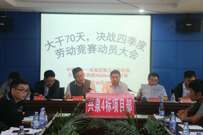 凝心聚力,堅(jiān)定信心。10月20日下午,中鐵二十一局集團(tuán)五公司興泉鐵路四標(biāo)項(xiàng)目部召開“大干70天 決戰(zhàn)四季度”勞動(dòng)競(jìng)賽動(dòng)員會(huì)。局指揮部黨工委書記高湛齊、分部班子成員、各部室、各架子隊(duì)、拌合站及各勞務(wù)隊(duì)負(fù)責(zé)人共計(jì)70余人參加。