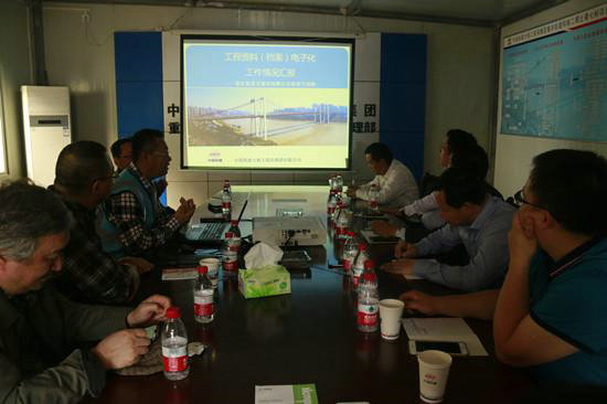 上午9時許,調(diào)研人員到達(dá)鵝公巖軌道專用橋施工現(xiàn)場,首先由項(xiàng)目經(jīng)理高學(xué)文針對工程概況、施工重難點(diǎn)以及現(xiàn)場施工進(jìn)度作了簡要介紹。參觀結(jié)束后,調(diào)研人員在會議室觀看了施工動漫并聽取了工程資料(檔案)電子化工作情況匯報。匯報共分為五部分,重點(diǎn)介紹了聲像檔案以及電子文件生成過程:聲像檔案共分為三個步驟,分別是現(xiàn)場拍攝、整理歸納、移交檔案;電子文件共分為四項(xiàng),分別是表格選用、填寫工程用表、簽字確認(rèn)以及移交檔案。