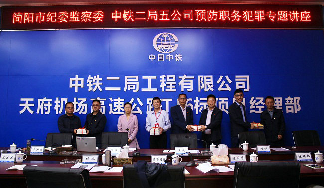 講座結(jié)束后,葉佳和中鐵二局五公司黨委副書記、紀(jì)委書記羅聶為項(xiàng)目員工代表贈(zèng)送廉潔書籍。羅聶表示,項(xiàng)目將以本次講座為契機(jī),將防范廉潔風(fēng)險(xiǎn)要求嵌入工程管理的每個(gè)關(guān)鍵崗位和關(guān)鍵環(huán)節(jié),領(lǐng)導(dǎo)干部要帶頭遵紀(jì)守法,為員工群眾做出表率,打造讓簡(jiǎn)陽市人民放心的優(yōu)質(zhì)工程。