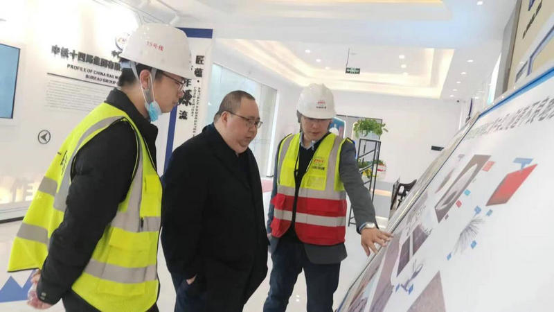 項目經理阮超(右1)向總承包部指揮長李兵(右2)匯報施工總體情況