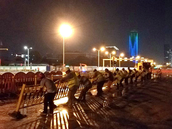 為了鼓舞士氣,譚書記親自去找便利店為大家買了紅牛等飲料,一來讓大家解解渴,二來也是讓大家喘口氣,歇會(huì)再干。“這么多天,我們起早貪黑的為了什么?不就是為了今天的導(dǎo)改么?我知道大家都很累,我也累,眼看就透亮了,大家再加把勁兒啊!”王總盤著腿坐在地上,一邊和大家一樣喝飲料補(bǔ)充著體能,一邊利用這個(gè)時(shí)間作著動(dòng)員。不一會(huì)兒,大家收拾好空瓶子又干了起來。凌晨3點(diǎn)左右,現(xiàn)場西北角的護(hù)欄率先全部擺放完畢。空閑下來的人帶來了繩子和叉車趕緊往東北角和西南角集合;凌晨4點(diǎn),所有護(hù)欄、水碼按計(jì)劃歸位,導(dǎo)改順利完成。
