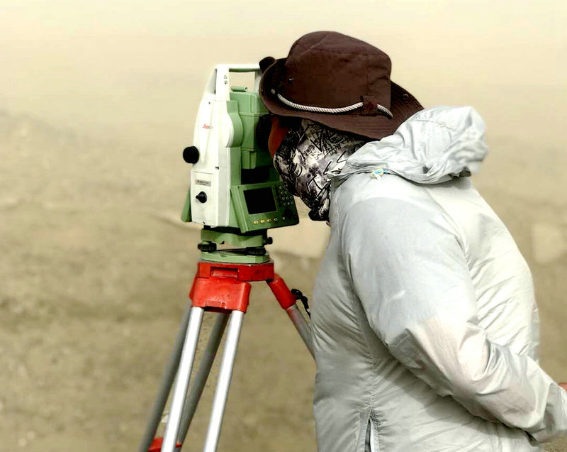 其實(shí),午飯問(wèn)題大家都還能接受,難以克服的還屬這里的沙塵暴天氣。規(guī)模較大的沙塵暴天氣能通過(guò)天氣預(yù)報(bào)提前做好防護(hù)措施,但是對(duì)于一些規(guī)模較小、突發(fā)性的沙塵暴天氣可就是測(cè)量員的災(zāi)難了。稍不注意,被石頭壓住的記錄本和圖紙便被狡猾的大風(fēng)帶上天,有時(shí)候,即便測(cè)量員們帶了“防護(hù)三件套”也無(wú)濟(jì)于事,鼻子、耳朵、嘴巴里都是黃沙,甚至連衣服兜也在不經(jīng)意間灌滿一口袋。