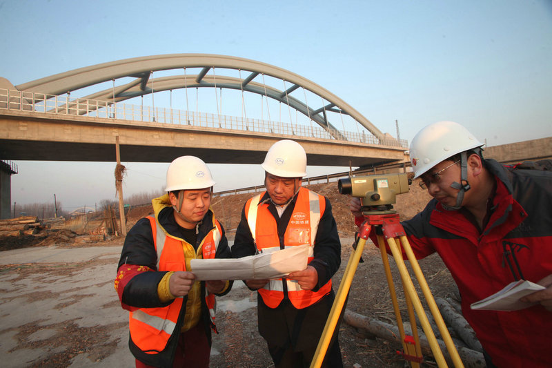 3、中鐵十八局集團(tuán)五公司建筑公司黨委書記胡興光(中)、唐曹鐵路項(xiàng)目副經(jīng)理劉小林(右)對跨唐津高速簡支梁進(jìn)行沉降復(fù)測(伍振 白雯 攝)
