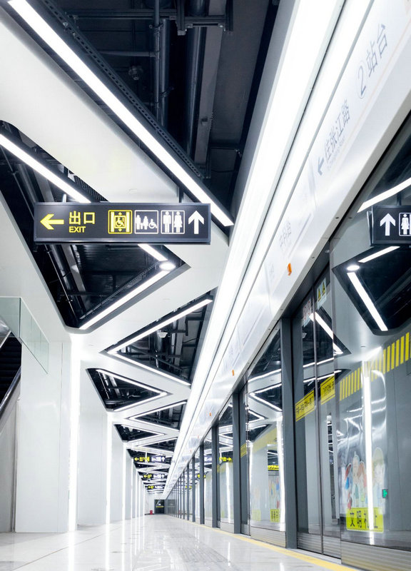作為張江科技城的門戶車站,中科路站的裝修理念也是極具時代氣息。鏡面不銹鋼構成的石墨晶體結構吊頂,地面上鋪滿黑白相間的幾何圖形,站廳中央的巨幅LED大屏實時展示地鐵建設運營的最新動態(tài),機電設備房裝修與色彩交相呼應。
