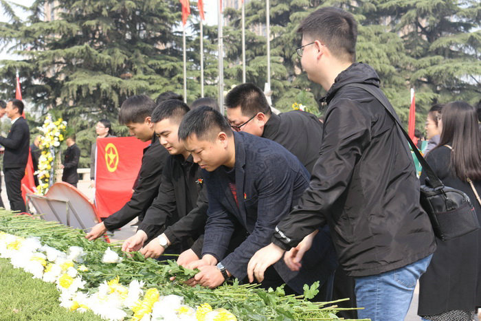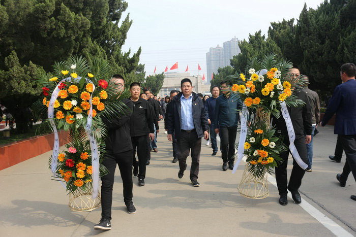 上午9時,祭奠隊伍一行20余人統(tǒng)一著裝、佩戴黨徽、手握鮮花、懷著崇敬的心情來到鄭州烈士陵園。首先映入眼簾的是高聳的革命烈士紀念碑,碑上周恩來總理題寫的“革命烈士永垂不朽”幾個金色大字剛勁有力。高大莊嚴的紀念碑象征著烈士們?yōu)榱藠Z取勝利、解放中國筑起的一道堅不可摧的精神長城。這里存放著“戰(zhàn)斗鐵人”吉鴻昌、“抗日英雄”楊靖宇、“赤膽忠心”吳煥先、“忠誠無畏”彭雪楓等141位革命先烈和4000多名為革命奮斗一生、鞠躬盡瘁的老干部骨灰,他們的一生,與江海同流、與日月同輝。