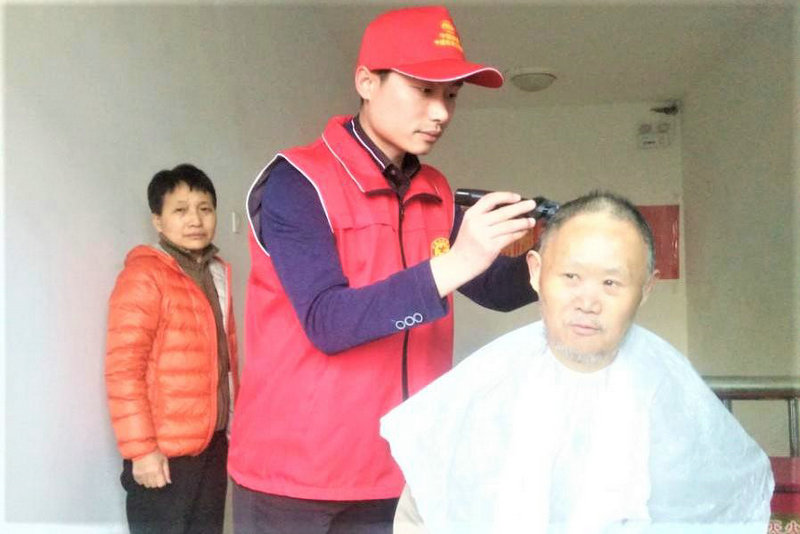 圖六、徐州地鐵2號線項目部志愿者走進徐州奎山敬老院開展愛心活動,為老人理發(fā)