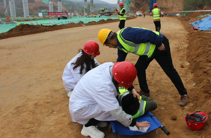 本次應(yīng)急救援活動共分六個小組,分別是通訊聯(lián)絡(luò)組、后勤保障組、緊急疏散組、搶險救援組、現(xiàn)場警戒組、醫(yī)療救護組。演練開始前,雷總召集應(yīng)急救援小組相關(guān)人員召開專題預(yù)備會議,說明本次組織演練活動的目的、意義、要求并分配了工作任務(wù)。各小組準(zhǔn)備就緒,等待指令?,F(xiàn)場模擬的是徐老莊互通橋G匝道施工現(xiàn)場有一名施工人員不慎從橋墩墜落,傷勢不明,請求支援?,F(xiàn)場接到指令后,根據(jù)《高空墜落應(yīng)急救援演練方案》,項目部立即啟動應(yīng)急救援,副指揮長隨即撥打市120急救中心電話,醫(yī)療救護組人員迅速準(zhǔn)備擔(dān)架、急救箱等醫(yī)療設(shè)備趕往事故現(xiàn)場,對其受傷的右腿及頭部傷口進行處理;現(xiàn)場警戒組在現(xiàn)場拉起警戒線,開始疏散圍觀人群;搶險救援組隨即進入,清理周邊材料,避免二次傷害;隨后,緊急疏散組及時到達現(xiàn)場,疏通救援通道,引導(dǎo)救護車輛進入事故現(xiàn)場;通訊聯(lián)絡(luò)組及后勤保障組保持通訊通暢,配合現(xiàn)場救援。各小組配合默契、處理得當(dāng)、反應(yīng)迅速,圓滿的完成了救援任務(wù)。15時35分,演練結(jié)束,各小組成員返回指揮中心。