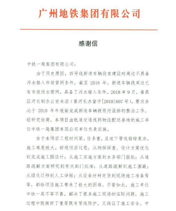 (廣州訊)4月10日,廣州地鐵集團(tuán)向中鐵一局集團(tuán)發(fā)來感謝信,就中鐵一局建安公司參建員工在廣州地鐵4號(hào)線新造車輛段雨污混排整治工作中所表現(xiàn)出的強(qiáng)烈責(zé)任感和大局意識(shí),以及在施工過程中所展現(xiàn)的攻堅(jiān)克難能力提出表揚(yáng),對(duì)全體參建員工按時(shí)按質(zhì)安全完成施工任務(wù)表示感謝! 廣州地鐵4號(hào)線新造車輛段建設(shè)之初,周邊尚不具備污水接入市政管網(wǎng)條件。2018年9月接入條件成熟后,廣州市番禹區(qū)河長(zhǎng)制辦公室要求2018年年底前必須完成車輛段雨污混排整治工作。 2018年9月,擔(dān)負(fù)廣州軌道交通線網(wǎng)物流配送基地施工任務(wù)的中鐵一局建安公司接到了廣州地鐵集團(tuán)下達(dá)的施工任務(wù),全力以赴,確保在年底前實(shí)現(xiàn)車輛段雨污混排管道接入市政管網(wǎng)。 “這是一項(xiàng)環(huán)保工程,更是一項(xiàng)政治工程。”接到施工任務(wù)后,建安公司迅速組織精干人員跑步進(jìn)場(chǎng)。當(dāng)時(shí),前期的勘測(cè)、設(shè)計(jì)工作尚未完成,工程施工無法展開。面對(duì)困境,全體參建人員表現(xiàn)出了高度的大局意識(shí)和責(zé)任意識(shí),通過抽調(diào)人員、設(shè)備參與人工詳探等形式,全力配合勘測(cè)、設(shè)計(jì)工作的開展。 工程開工后,面對(duì)工期緊,任務(wù)重的嚴(yán)峻形式,項(xiàng)目管理團(tuán)隊(duì)精心組織生產(chǎn)、科學(xué)安排施工,克服了地下管線雜,交通疏解難,綠化遷移多等困難,通過倒排工期、合理組織交叉施工,采用人工開挖敷設(shè)排污管道等措施,全力以赴的搶抓施工進(jìn)度。在此期間,項(xiàng)目管理團(tuán)隊(duì)安全跨越跨越兩條高壓線、三條通訊光纖以及一條大口徑自來水供水管道,并于2018年12月份按時(shí)按質(zhì)完成施工任務(wù),并投入正常使用,得到了相關(guān)單位的一致好評(píng)!