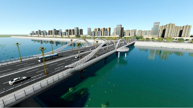 崇文街大橋工程,位于福山區(qū)崇文街與河濱路交叉口,東起河濱東路,西至河濱路,全長216米、寬45米,采用雙向八車道布置,設(shè)計時速50公里每小時,工程計劃投資約5300萬元。橋梁設(shè)計圍繞 “飛鳥”這一特色主題,造型采用雙飛燕式異形拱為裝飾結(jié)構(gòu),橋梁形似一只展翅飛鳥遨游河邊,結(jié)合周邊碧水晴空的自然景觀,寓意未來的和諧環(huán)境,彰顯“福山飛躍”的美好寓意。
