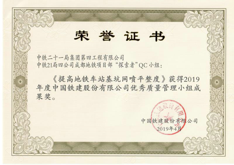 近日,中鐵二十一局四公司成都地鐵6號(hào)線土建7標(biāo)項(xiàng)目部“探索者”QC小組發(fā)布的《提高地鐵車站基坑網(wǎng)噴平整度》QC成果獲2019年度中國(guó)鐵建股份有限公司優(yōu)秀質(zhì)量管理小組活動(dòng)成果獎(jiǎng)。
