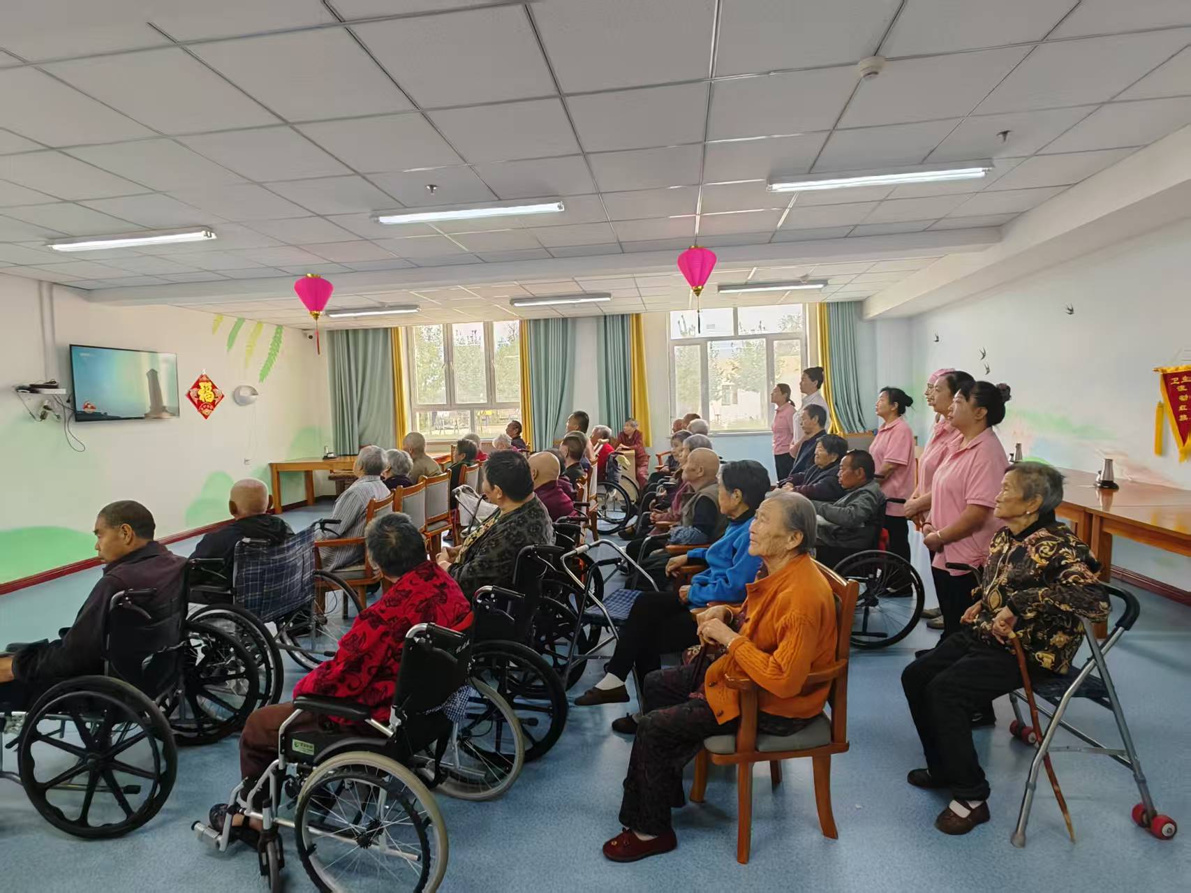 圖2為:9月3日早晨,奇臺(tái)110社區(qū)吾家樂寶養(yǎng)老院的在院長(zhǎng)者及員工們,早早地聚焦在“養(yǎng)生堂”餐廳,自覺集中收聽收看中央電視臺(tái)直播紀(jì)念中國(guó)人民抗日戰(zhàn)爭(zhēng)暨世界反法西斯戰(zhàn)爭(zhēng)勝利80周年紀(jì)念大會(huì)等紀(jì)念活動(dòng)實(shí)況。