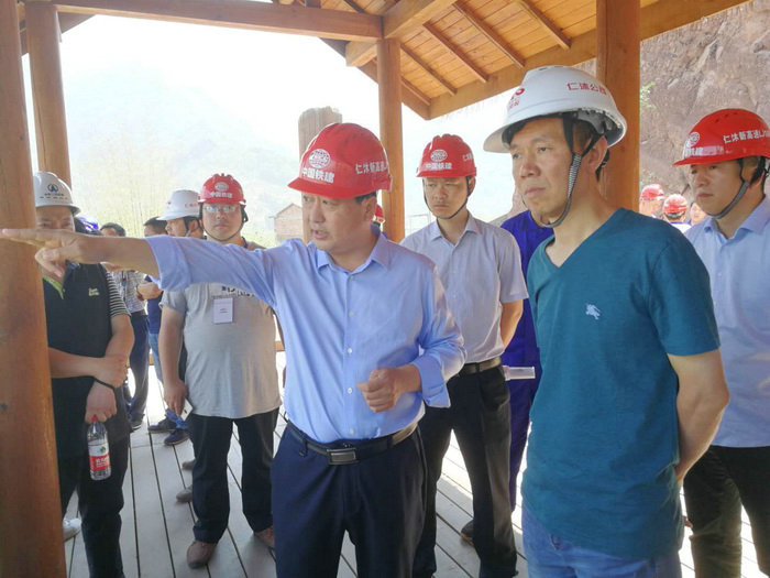莊乾理(中)在現(xiàn)場(chǎng)向劉勇董事長(zhǎng)(右二)介紹工地情況