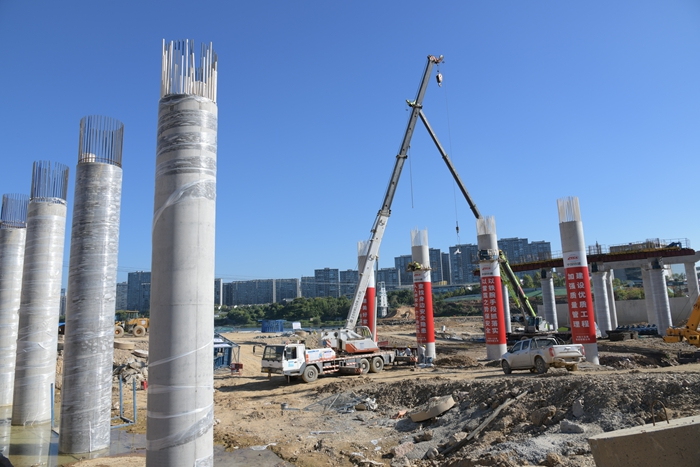 富足山舊橋位于城區(qū)文峰路上,全長300米、寬18米、高19米,運行30年,是常山縣33.6萬人出行,與杭州、江西上饒等地密切聯(lián)系的重要通道,被當(dāng)?shù)厝朔Q為民生橋。新建富足山大橋在舊橋原址上,與天馬樞紐泄洪閘相距約30米,橋墩和橋面橫跨導(dǎo)流墻。該橋全長376.8米、11垮、高19米、寬27.5米,直徑1.5—1.8米的樁基46根,直徑1.7米的墩柱42個,9、10垮為通航通道,上部為T梁結(jié)構(gòu),橋面兩側(cè)各增加2.75米寬的人行道和3米寬的非機動車道。2024年11月開工建設(shè)。該項目在樁基施工中,利用冬春雨水少的特點,從兩端向中間推進(jìn),為橋墩施工創(chuàng)造了條件。今年汛期過后,項目部建起一座100多米長的漫水橋,右側(cè)5排20根墩柱和蓋梁完成后,填筑起一座6米多高的圍堰,將常山江水改變流向,從完工的墩柱位置流過,抽干左側(cè)河道的積水,組織人力和機械進(jìn)行樁基施工。在墩柱施工中,采取在破樁頭后的樁基上綁扎鋼筋籠、安裝定型鋼模、一次性灌注的辦法,使拆模后的墩身顏色一致、光潔如玉,受到業(yè)主、監(jiān)理單位的好評。