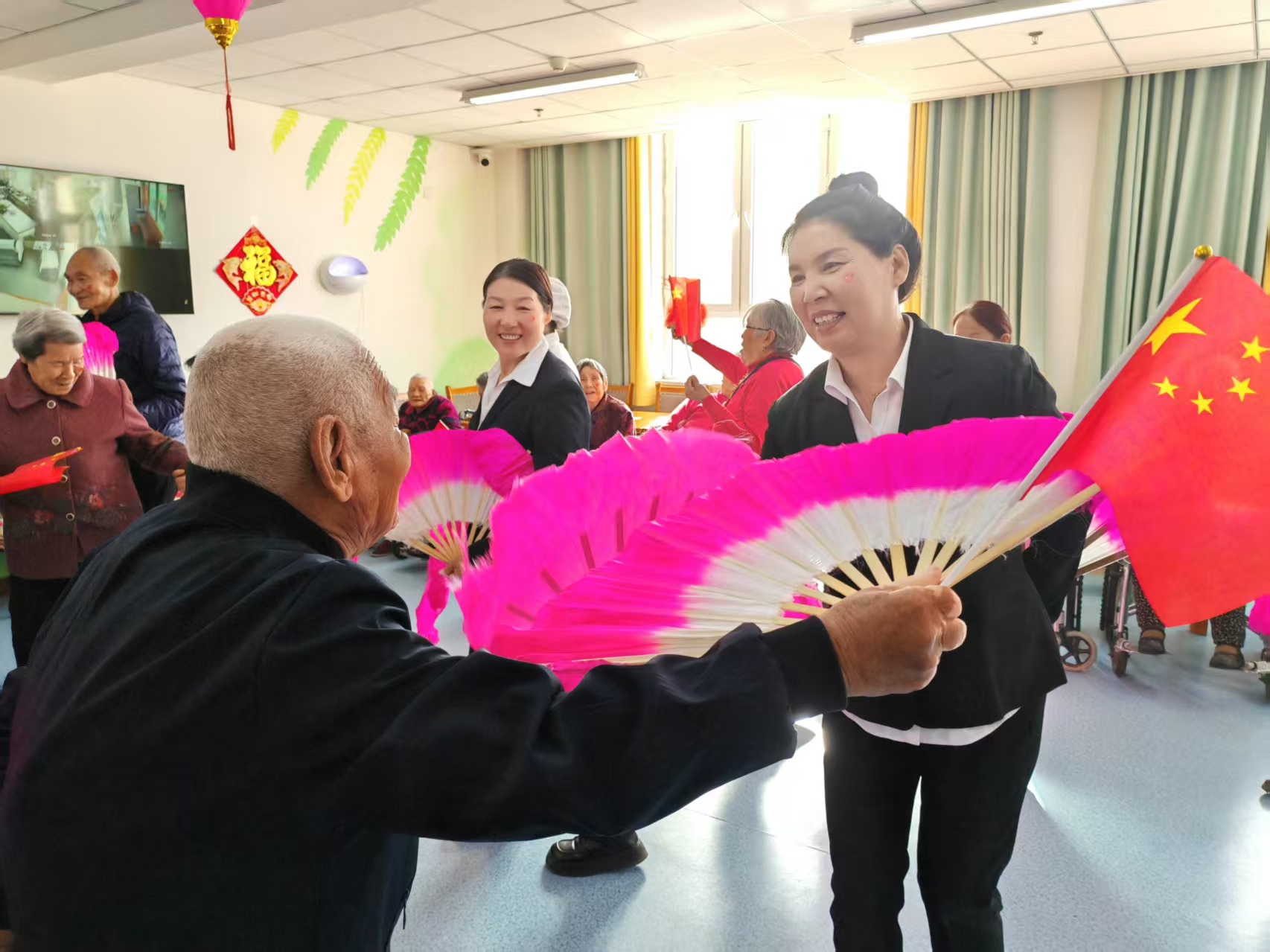 圖3為:在奇臺110社區(qū)吾家樂寶養(yǎng)老院舉辦的“國慶集體生日會”中,長者與員工們扭起了充滿喜慶的大秧歌。