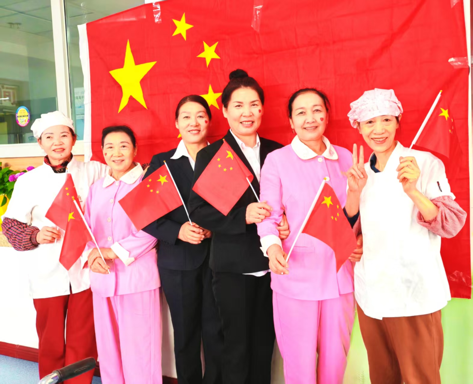 圖2為:時值國慶佳節(jié),奇臺110社區(qū)吾家樂寶養(yǎng)老院的員工們在鮮艷的國旗下親密合影。