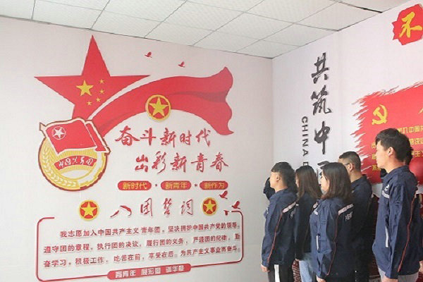 “我志愿加入中國共產主義青年團,堅決擁護中國共產黨的領導……”團員代表們在項目部黨建工作活動室重溫入團誓詞。