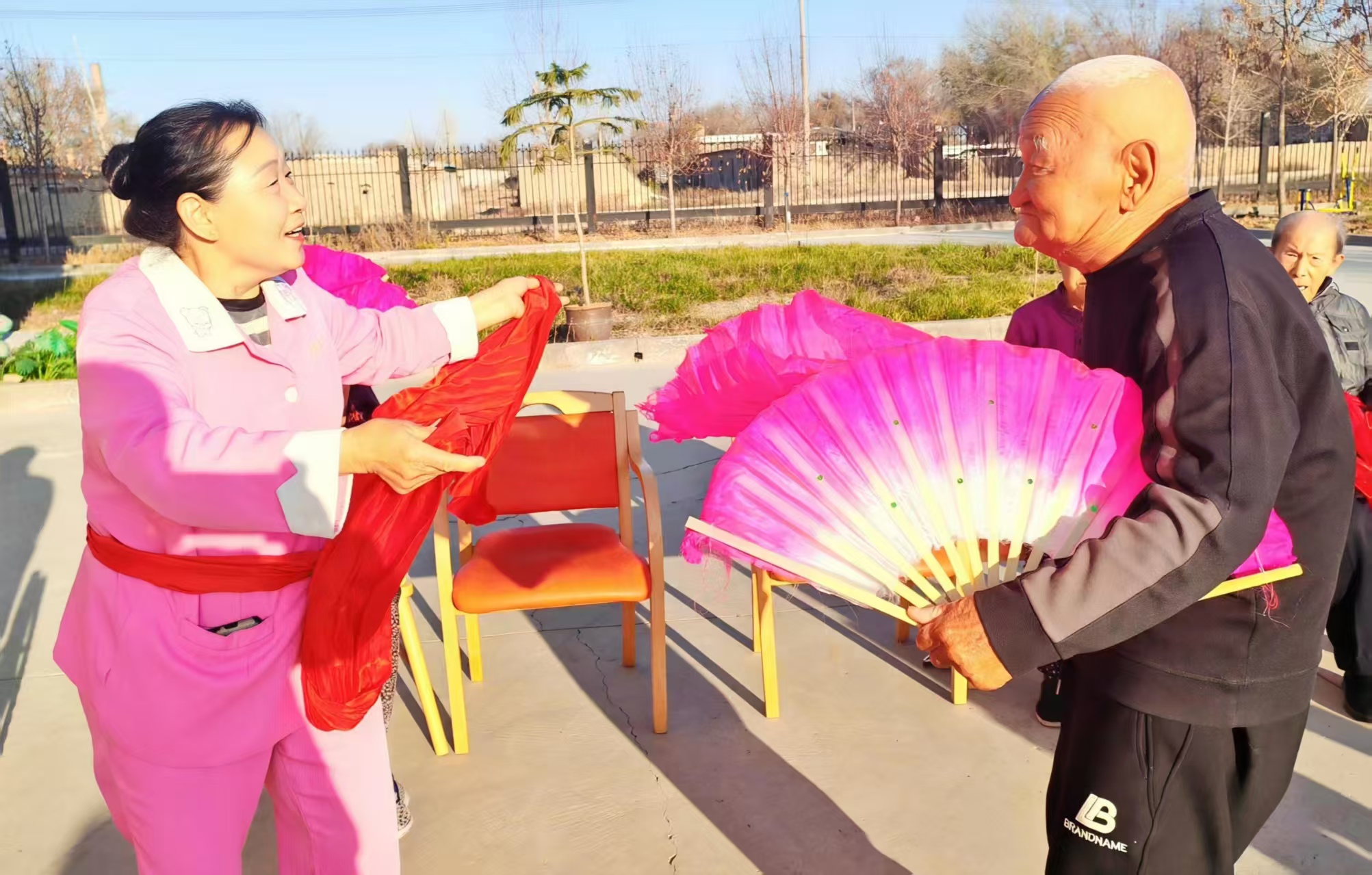 圖2為:六師奇臺(tái)農(nóng)場(chǎng)110社區(qū)吾家樂(lè)寶養(yǎng)老院97歲“老寶貝”張振民老爺爺(右 ),與護(hù)理員競(jìng)舞秧歌,用充滿活力的舞步,宣告自己桑榆不老。