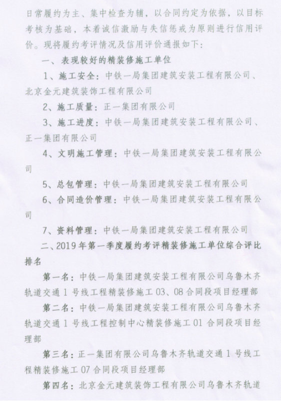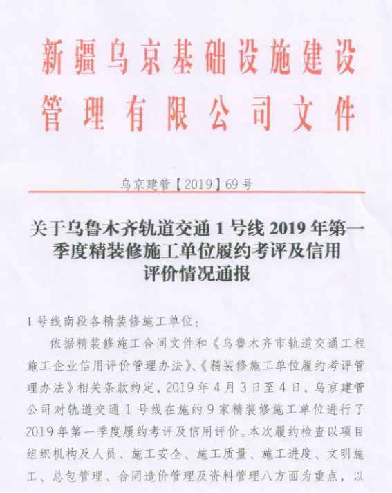 近日,在本次檢查的9家精裝修施工單位中,中鐵一局建安公司烏魯木齊軌道交通1號線精裝修03、08合同段項目榮獲季度綜合考評第一名,1號線控制中心裝修01合同段項目榮獲綜合考評第二名。新疆烏京基礎(chǔ)設(shè)施建設(shè)管理有限公司發(fā)布了烏魯木齊軌道交通1號線南段精裝修施工單位2019年第一季度履約考評及信用評價結(jié)果。 中鐵一局建安公司烏魯木齊軌道 1號線精裝修03、08合同段負責(zé)施工烏魯木齊1號線南段二道橋站、新疆大學(xué)站和王家梁站的公共區(qū)精裝修;1號線控制中心裝修01合同段負責(zé)施工烏魯木齊軌道交通產(chǎn)業(yè)總部基地控制中心A、D座室內(nèi)精裝修施工。項目部在現(xiàn)場施工條件不利因素下,積極策劃,主動同各方溝通爭取作業(yè)面和作業(yè)時間,在人員、機械和材料上加大投入,確保施工進度不受影響;同時積極開展圖紙研討,加強現(xiàn)場施工人員安全、技術(shù)培訓(xùn),建立項目質(zhì)量管理體系,不斷在做實做細上下功夫。在本次考評中,業(yè)主對項目部在施工安全、進度管控、文明施工、總包管理、合同造價管理和資料管理等六個方面的工作進行了表揚。 下一步,項目部將繼續(xù)提高施工管理人員思想意識,嚴(yán)格管理要求,樹立大局意識,鼓足干勁克服困難,加強安全,控制質(zhì)量,加快推進施工進度,爭取在二季度考評中再創(chuàng)輝煌。