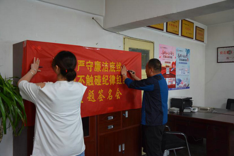 會后,還舉行了“嚴(yán)守廉潔底線,絕不觸碰紀(jì)律紅線”主題簽名活動(dòng),機(jī)械化公司全體職工在紅幅上留下了自己的名字。經(jīng)理李鯤說到:簽字意味著對自己的承諾,對黨的承諾,寧可清貧自樂,不可濁富多憂,大家要更加認(rèn)識到紀(jì)律的重要性,把握好正確的人生方向。