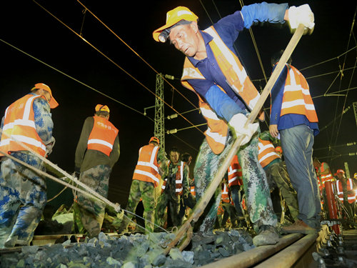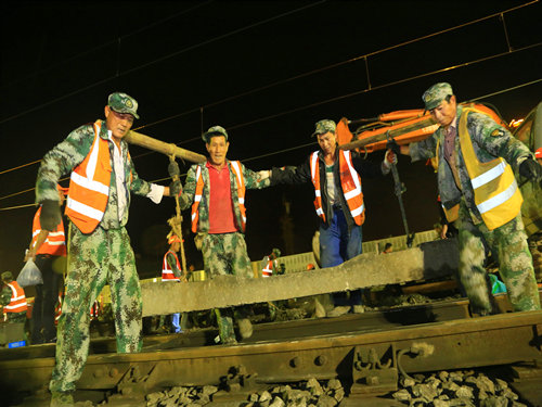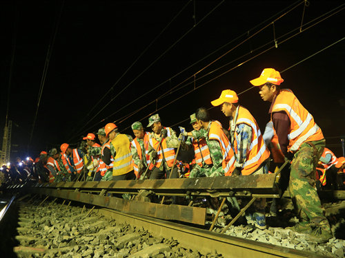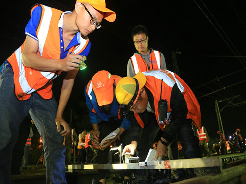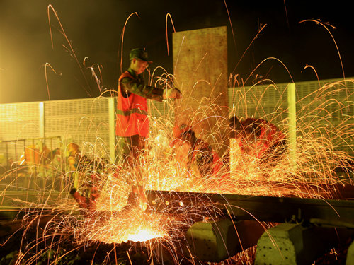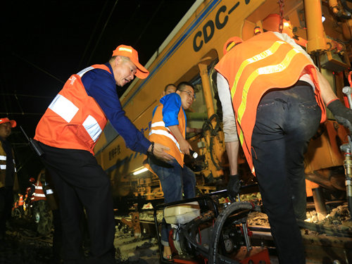 “調(diào)度命令已下達,開始作業(yè)!”當晚21時00分,施工負責人一聲令下,準備多時的“鐵醫(yī)生”們?nèi)珉x弦之箭,迅速沖上線路,發(fā)動馬達、拆卸夾板,安裝切軌機......一時間,指揮聲、吶喊聲、機器轟鳴聲頓時響徹整個施工現(xiàn)場。
