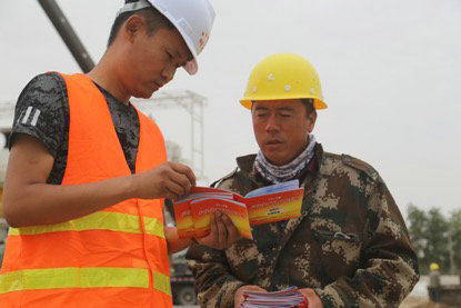 “我是一名中國鐵建員工……我鄭重承諾……將以實際行動,確保企業(yè)生產(chǎn)安全、產(chǎn)品優(yōu)質(zhì)!”在項目部舉行的“安全生產(chǎn)月”宣誓活動中,全體參建職工莊嚴宣誓,同時在活動橫幅上鄭重的簽下自己的名字。同時,項目部給每一位給勞務人員發(fā)放了安全宣傳手冊,并一一講解了安全施工應注意的事項,用實際行動履行安全責任,增強安全技能,保障安全生產(chǎn)。