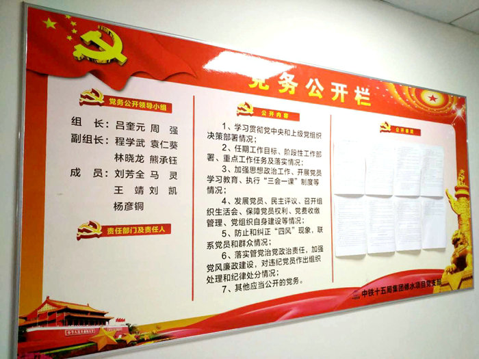 黨務(wù)公開欄修水G353項(xiàng)目2月份開工,工期緊、安全壓力大。黨支部充分發(fā)揮黨建工作優(yōu)勢(shì),引領(lǐng)黨員干部提升履職能力,激發(fā)其內(nèi)在活力、敢于擔(dān)當(dāng)和較強(qiáng)的責(zé)任心,將思想和行動(dòng)集中到完成工期、安全、質(zhì)量、效益、環(huán)保計(jì)劃目標(biāo)上來。黨支部按照公司黨委的工作部署和項(xiàng)目實(shí)際,經(jīng)過反復(fù)醞釀,推出了黨支部工作安排、創(chuàng)建四好班子實(shí)施方案、黨風(fēng)廉政建設(shè)發(fā)腐敗工作要點(diǎn)等多項(xiàng)工作計(jì)劃,并有步驟地狠抓落實(shí)。首先在黨員中開展?fàn)巹?chuàng)“紅旗責(zé)任區(qū)”、“黨員先鋒崗”、“黨員之星”活動(dòng),要求每個(gè)黨員戴黨徽、亮身份、寫承諾,時(shí)刻不忘入黨誓詞和履行黨員的義務(wù)。7名黨員在管理、技術(shù)、政工等崗位上身先士卒、勇挑重?fù)?dān),用榜樣的力量帶動(dòng)職工戰(zhàn)勝隧道塌方等層出不窮的難題。