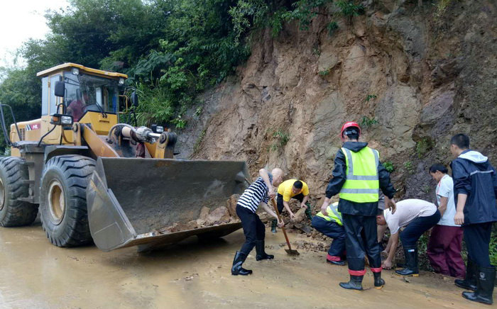 清理公路塌方 拌合站和預(yù)制場處在地勢(shì)低洼處,旁邊緊鄰河溝,一下暴雨就對(duì)場地沖刷嚴(yán)重。值班人員冒著大暴雨沿觀察河水上漲和山體動(dòng)向,發(fā)現(xiàn)洪水夾著泥石流把剛澆筑的龍門吊基座掏空,地磅也漂浮起來,搶險(xiǎn)人員立即用挖機(jī)裝石塊進(jìn)行圍擋,連續(xù)備戰(zhàn)3個(gè)多小時(shí),保住了基座和地磅不被洪水沖走。