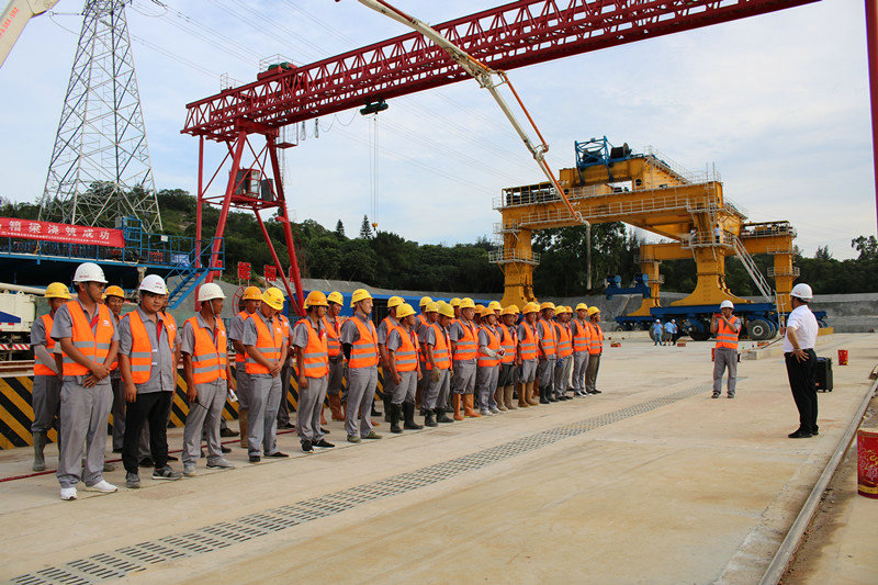 為確保首榀箱梁順利澆筑,梁場項目領(lǐng)導(dǎo)班子召開施工部署會,精心組織、細(xì)化分工、分解任務(wù)、保證施工過程環(huán)環(huán)相扣。晉江制梁場項目部上場以來,班子成員發(fā)揮帶頭作用,帶領(lǐng)項目部全體員工克服征地拆遷難,臨建工程難度大等困難,不畏艱難、超前謀劃、統(tǒng)籌安排,對梁場施工任務(wù)不斷進(jìn)行調(diào)整。同時,認(rèn)真加強對一線工人的崗前技術(shù)交底、安全培訓(xùn),嚴(yán)把過程質(zhì)量控制,確保了首榀箱梁的順利灌注,為晉江制梁場箱梁批量生產(chǎn)奠定堅實基礎(chǔ)。