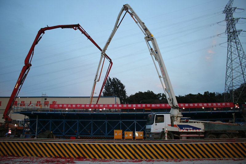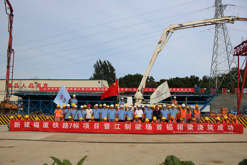 6月5日,天高云淡,陽光明媚,中國鐵建大橋局福廈鐵路7標(biāo)晉江制梁場一片熱鬧景象,一紅一白兩臺混凝土輸送泵車大臂高聳入云,各種制梁設(shè)備整裝待發(fā),施工人員精神抖擻,在一陣鞭炮聲中,首榀箱梁開始澆筑,經(jīng)過6個小時的連續(xù)施工,宣告預(yù)制成功,標(biāo)志著福廈鐵路7標(biāo)箱梁預(yù)制施工全面拉開序幕。