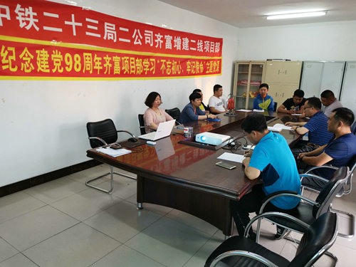 6月23日,中鐵二十三局集團二公司齊富增建二線工程項目部為紀念建黨98周年開展黨課學習。項目部書記李勝臣作了題為“不忘初心、牢記使命”的專題黨課。