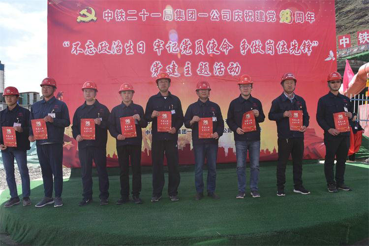 為慶祝建黨98周年,6月26日,中鐵二十一局一公司黨委在京新高速公路項(xiàng)目部大石頭隧道工地,開(kāi)展了“不忘政治生日 牢記黨員使命 爭(zhēng)做崗位先鋒”黨建主題活動(dòng)。