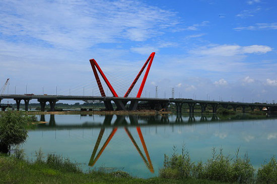 藍(lán)天碧水間,艷紅色斜拉橋跨越微波蕩漾的淠河,多角度呈現(xiàn)正“V”字型或倒“V”字型,象征著將軍之鄉(xiāng)、勝利之城六安奮發(fā)向上的新時(shí)代精神。大橋全長(zhǎng)845米,主橋長(zhǎng)178米,標(biāo)準(zhǔn)寬度為47米,雙向6車道。大橋?qū)儆陔p向大傾角無(wú)背索斜塔斜拉橋,兩個(gè)非對(duì)稱斜塔與橋面的縱向傾角為58度,是國(guó)內(nèi)最大的傾角斜塔,主塔上塔柱垂直高70米,副塔上塔柱垂直高50米,下塔柱高約18.5米。兩個(gè)塔的橫向傾角是103度和101度。共設(shè)置24對(duì)48根斜拉索。其獨(dú)特造型在國(guó)內(nèi)絕無(wú)僅有,仿佛一座建筑藝術(shù)品。