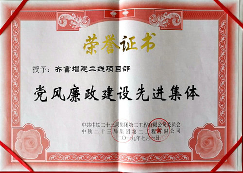 2019年,中鐵二十三局集團二公司齊富增建二線項目部高舉習近平新時代中國特色社會主義思想偉大旗幟,深入學習貫徹黨的十九大精神,以黨風廉政建設為統(tǒng)領,思想建黨、紀律強黨、制度治黨協(xié)同發(fā)力,嚴格落實中央精神,堅持不懈糾正“四風”,每名黨員干部均自覺簽署了“廉潔責任書”,毫不動搖地推動全面從嚴治黨、黨風廉政建設和反腐敗工作。經(jīng)中共中鐵二十三局集團第二工程有限公司委員會、中鐵二十三局集團第二工程有限公司綜合評定,授予齊富增建二線項目2019年度“黨風廉政建設先進集體”榮譽稱號,同時,該項目人員王鐵超、王雷被授予“黨風廉政建先進個人”榮譽稱號。