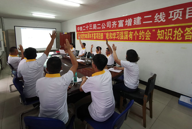 齊富項目部為深入學(xué)習(xí)習(xí)近平新時代中國特色社會主義思想,推進(jìn)全項目黨員干部“學(xué)習(xí)強(qiáng)國”學(xué)習(xí)平臺的使用工作,7月5日,中鐵二十三局集團(tuán)第二工程有限公司齊富增建二線工程項目黨支部開展了“我與學(xué)習(xí)強(qiáng)國有個約會”知識搶答競賽活動,紀(jì)念建黨98周年。