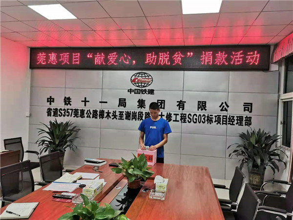 贈人玫瑰,手留余香。7月9日,中鐵十一局二公司莞惠項目積極響應公司黨委號召,落實“獻愛心助脫貧”活動,項目領導帶頭,全體黨員、團員青年踴躍捐款,紛紛獻出一份愛心。大家50元、100元量力而行。項目經(jīng)理李峰作表率捐款500元;項目書記因出差缺席捐款現(xiàn)場,但仍通過轉(zhuǎn)賬獻上自己的一份愛心愛心捐款500元。項目同時開通了支付寶和微信捐款便捷方式以方便大家獻愛心。