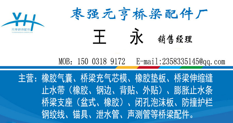 棗強(qiáng)元亨橋梁配件廠坐落于橡膠之鄉(xiāng)的河北衡水市,集研發(fā)、生產(chǎn)、銷售、咨詢和應(yīng)用服務(wù)于一體的專業(yè)生產(chǎn)多用途氣囊容器產(chǎn)品的獨(dú)資企業(yè)。我廠擁有專業(yè)技術(shù)人員和專業(yè)機(jī)械設(shè)備及專業(yè)焊工隊(duì)伍。 我廠以專業(yè)的隊(duì)伍、嚴(yán)謹(jǐn)?shù)墓芾?、超卓的設(shè)備,專業(yè)生產(chǎn)質(zhì)量一流的橋梁配件。主營(yíng):橡膠氣囊,工程橡膠充氣芯模,高壓氣囊,橋梁橡膠充氣芯模,市政管道封堵氣囊,A級(jí)全膠氣囊,帶法蘭盤橡膠氣囊,帶拉手純膠氣囊,高速公路鐵路梁板氣囊,混凝土襯托芯模,隧道涵洞氣囊,邊溝芯膜,箱涵芯模,閉水實(shí)驗(yàn)堵,閉氣試驗(yàn)堵,試驗(yàn)堵,橡膠護(hù)舷,封堵氣囊閉水堵,橡膠氣堵,充氣氣堵,充氣氣囊,橡膠氣囊布,排水管道堵水工具,管道用氣囊,橋梁板式支座,板式支座,橡膠膠板(厚度1mm-100mm),帶孔橡膠支座,橡膠止水帶,鋼邊止水帶,止水環(huán),止水條,接頭機(jī),止水帶膠水,橋梁支座,橋梁伸縮裝置,閉孔泡沫板,雙組份聚硫密封膠(膏),護(hù)欄支架,聲測(cè)管,泄水管,鋼絞線,錨具等橋梁配件。