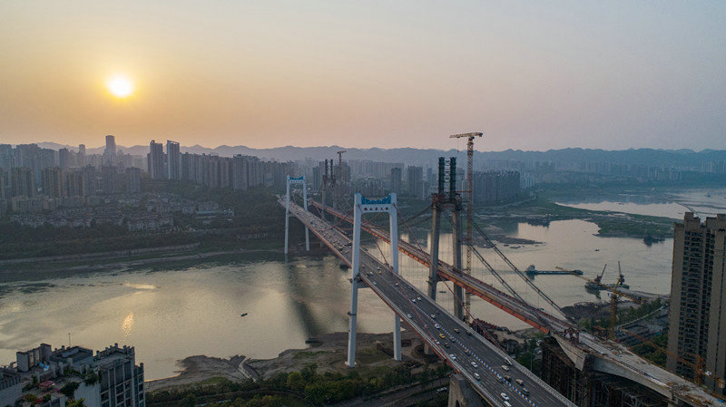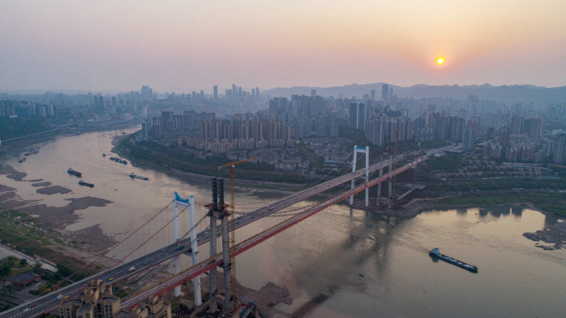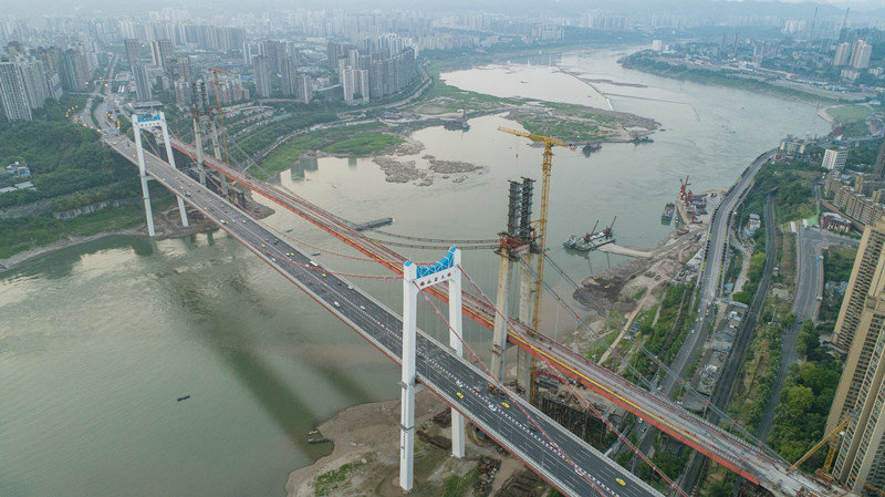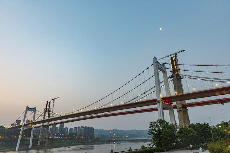 由中國(guó)鐵建投資集團(tuán)投資、中國(guó)鐵建大橋局施工的鵝公巖軌道專用橋是重慶軌道環(huán)線南環(huán)的控制性工程,鏈接長(zhǎng)江九龍灘區(qū)東西兩岸。大橋全長(zhǎng)1650.5米,施工中首創(chuàng)的“斜拉轉(zhuǎn)懸索”施工工藝,將世界自錨式懸索橋最大跨度最終定格在600米。