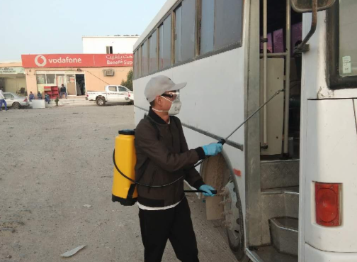 2、中鐵十八局集團(tuán)卡塔爾分公司防疫人員對車輛進(jìn)行消毒(楊國輝攝)