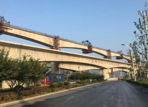 本次合龍的北端下行聯(lián)絡(luò)線特大橋60+2*100+60米現(xiàn)澆預(yù)應(yīng)力砼連續(xù)梁全橋長(zhǎng)321.5m,橋?qū)?.4m,為標(biāo)段內(nèi)跨度最大的單線連續(xù)梁。項(xiàng)目管段內(nèi)共有8聯(lián)連續(xù)梁屬于鄰近營(yíng)業(yè)線施工,并行線路多,鄰近營(yíng)業(yè)線施工區(qū)間平行分布4條鐵路,從左側(cè)向右側(cè)依次為商合杭鐵路正線、北端下行聯(lián)絡(luò)線、合福高鐵、北端上行聯(lián)絡(luò)線,梁緣距合福線翼緣板水平距離最近處僅為4.77米,新建連續(xù)梁最高墩達(dá)37米(相當(dāng)于12層樓高),此外還跨越公路等,施工作業(yè)區(qū)相當(dāng)狹窄,安全風(fēng)險(xiǎn)極大,施工中稍有不慎,就會(huì)造成極其嚴(yán)重交通堵塞甚至危急行車安全,這種復(fù)雜的施工條件在國(guó)內(nèi)尚無(wú)施工經(jīng)驗(yàn)可供借鑒。如此環(huán)境施工被形象地比喻成“在刀尖上跳舞”。